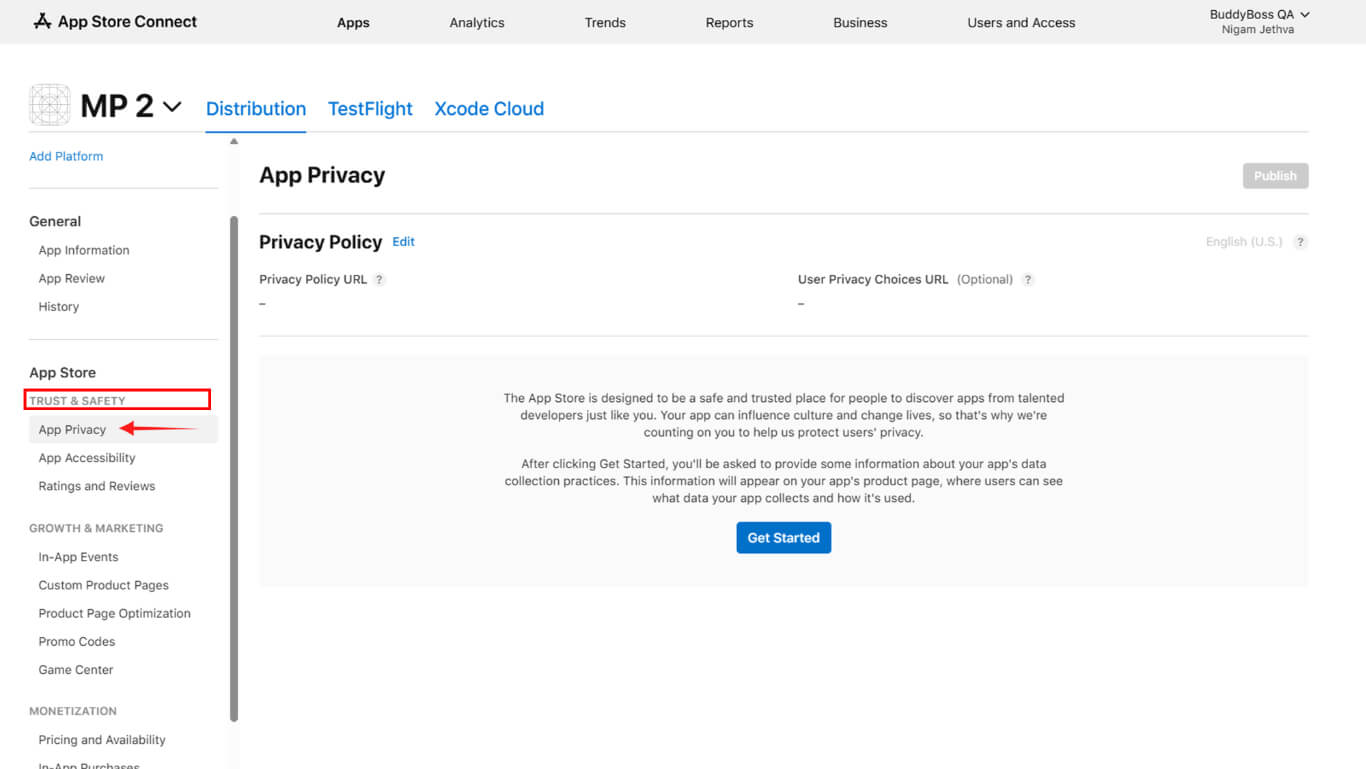 - Vaya a App Privacy > Trust and Safety in App Store Connect.