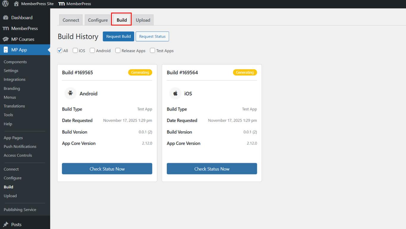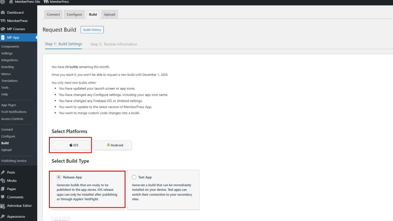 - Vaya a Dashboard > MP App > Build.