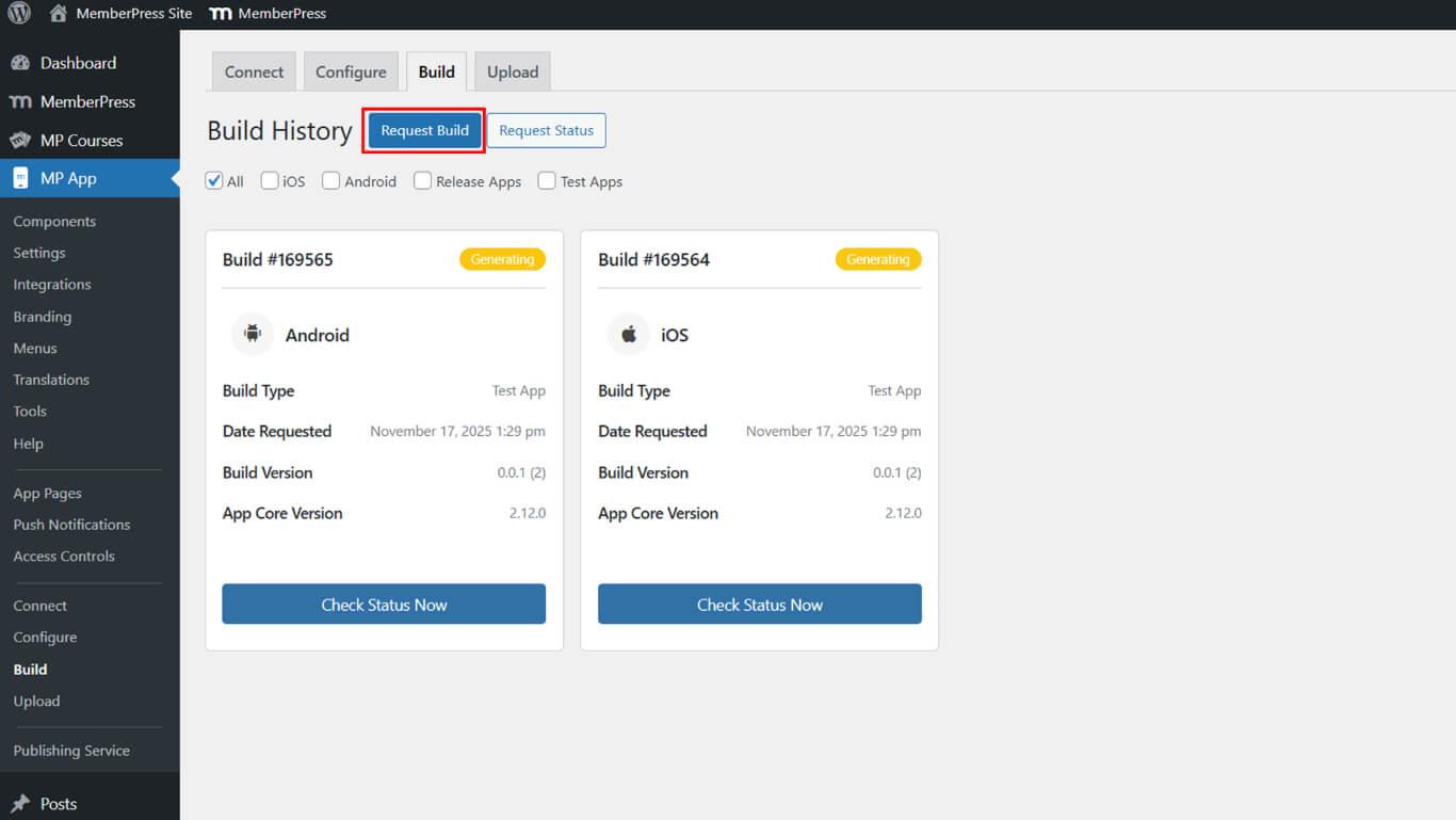 - Haga clic en el botón Solicitar Construya botón.