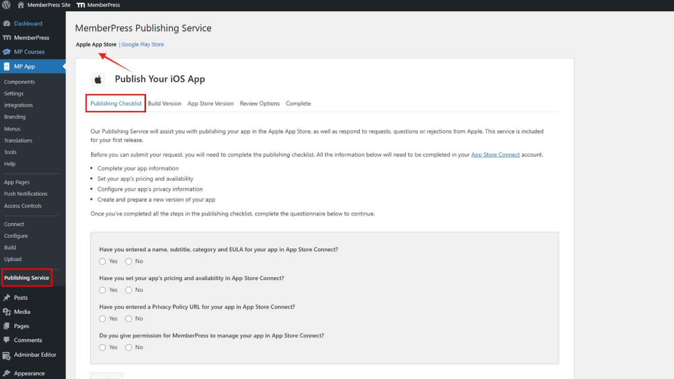 - Vaya a Dashboard > MP App > Publishing Service > Apple App Store en WordPress.