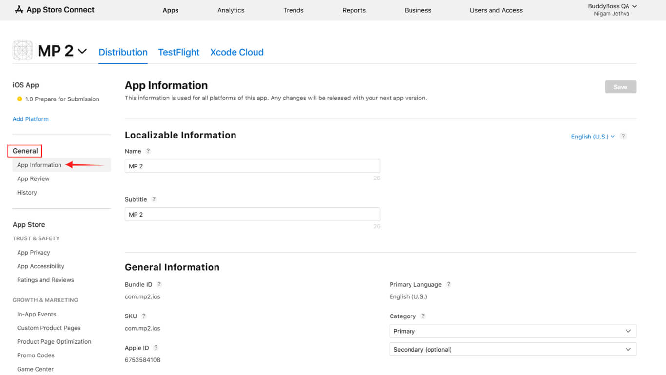 - Haga clic en App Information under the General section.