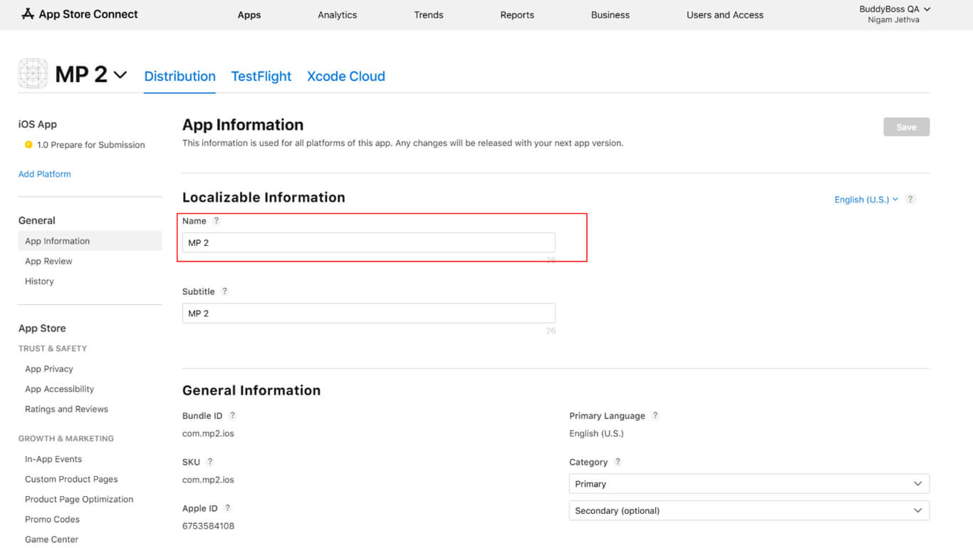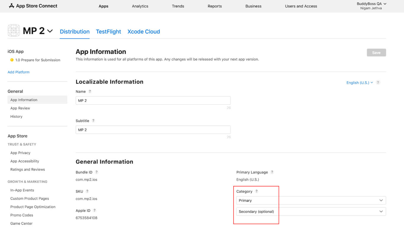 App Information configuration establishes basic app details in App Store Connect.