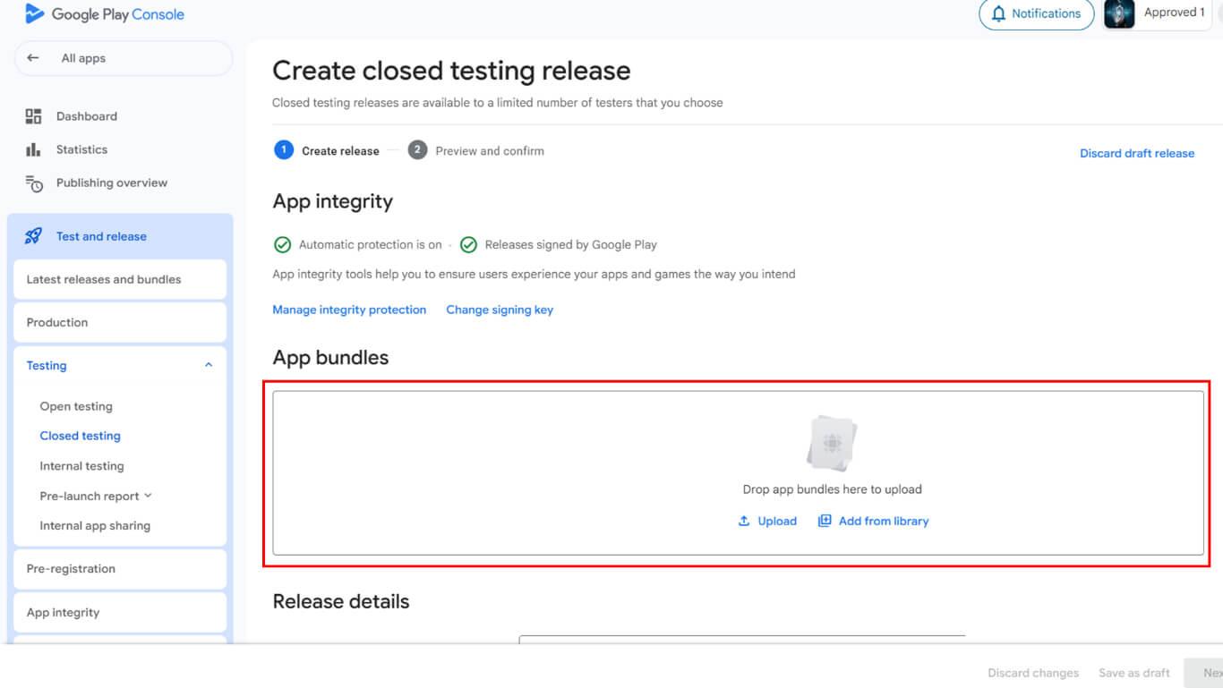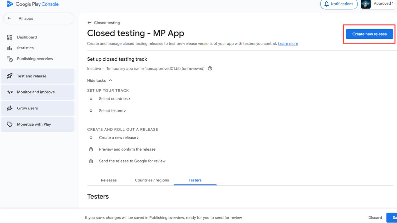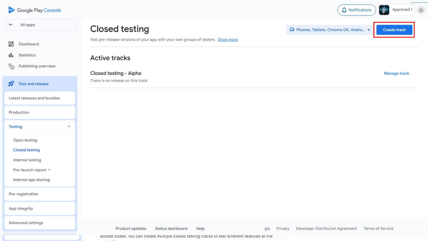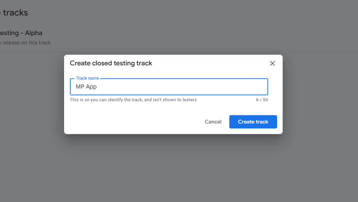 Closed testing track creation establishes the testing environment for pre-release app distribution.