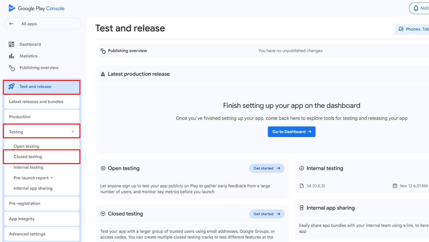 - Navigate to the app dashboard in Google Play Console after completing testing requirements.