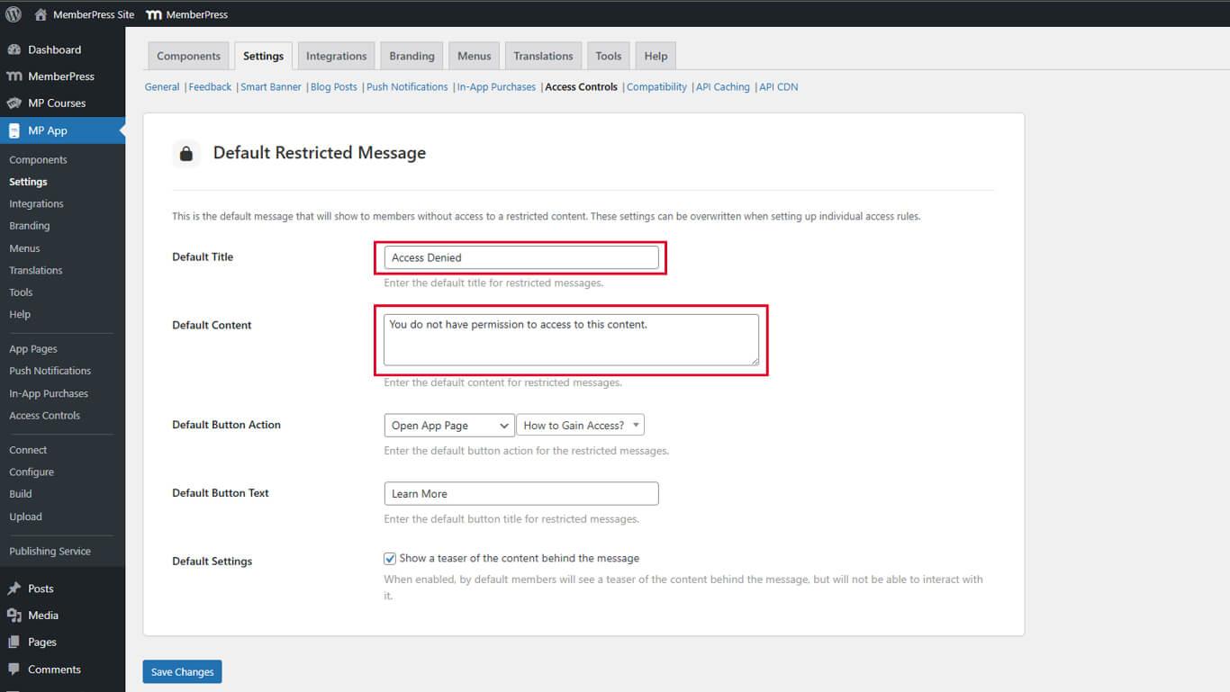 Restricted content requires clear communication explaining access limitations and next steps. The default restricted message displays when members encounter locked content within the app. This document explains how to configure message content, customize call-to-action buttons, and enable content teasers for restricted pages.