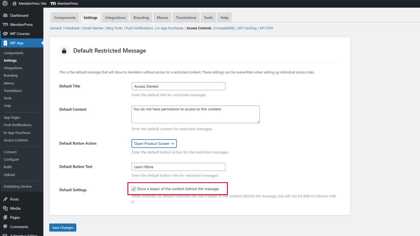 - Localice el Show Teaser checkbox under Default Restricted Message.