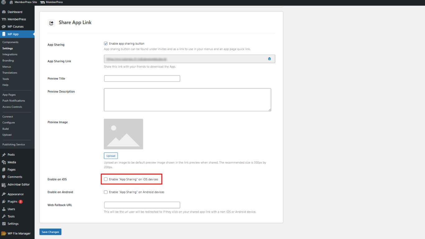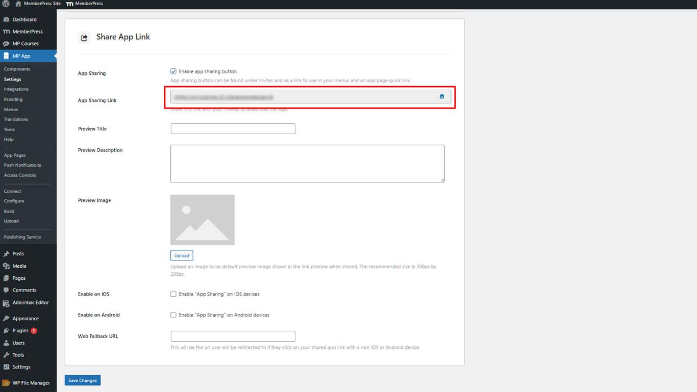 - At the top of the Share App Link settings, locate the App Sharing Link.