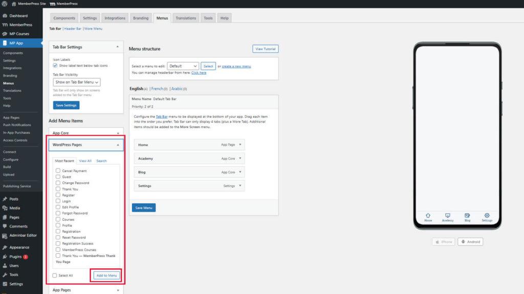 - In your WordPress Dashboard, go to MP App > Menus.