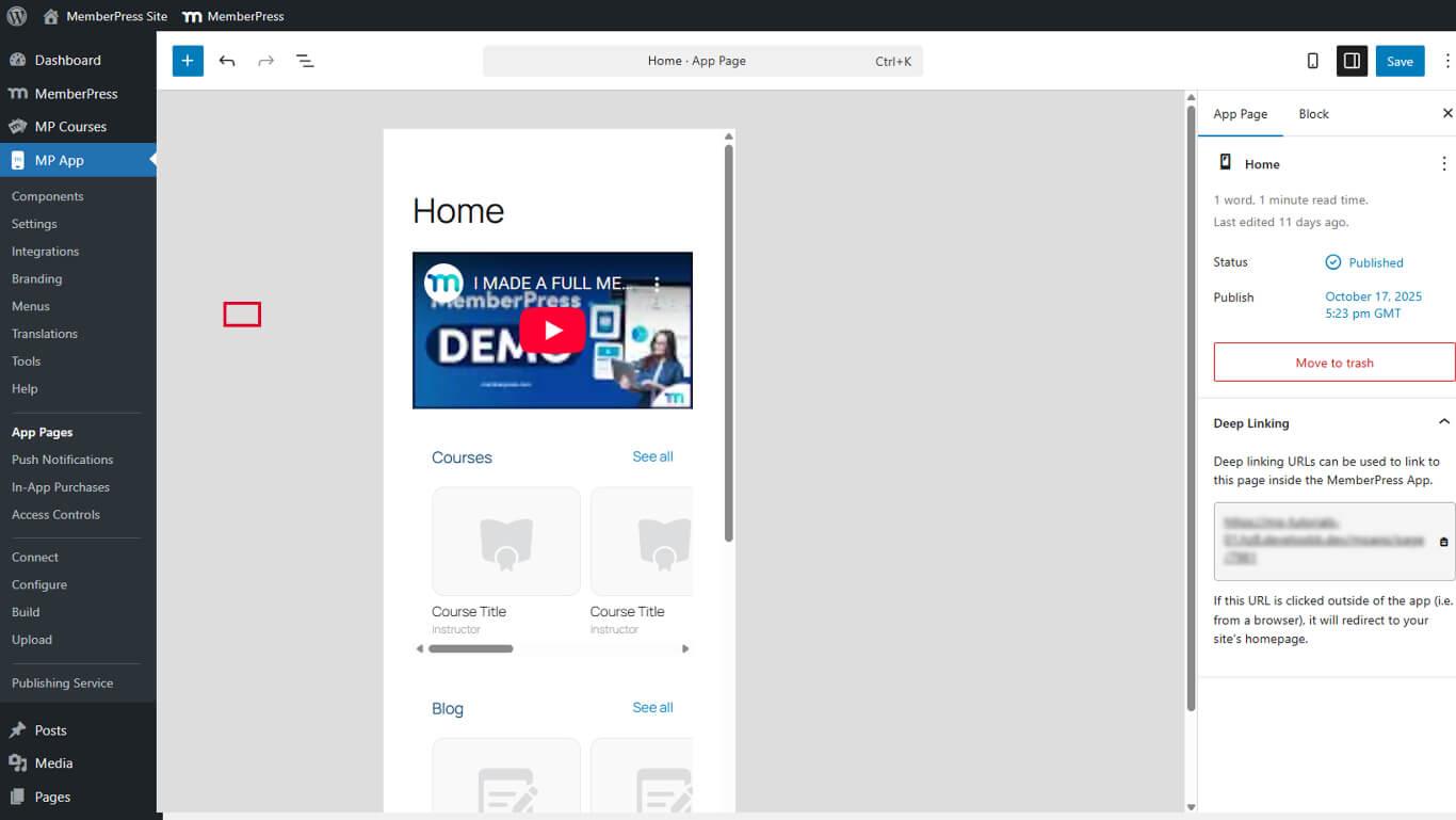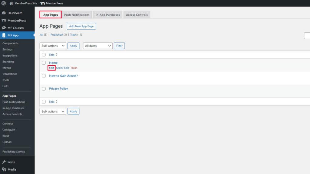 - Ir a MP App > App Pages and edit the desired page.