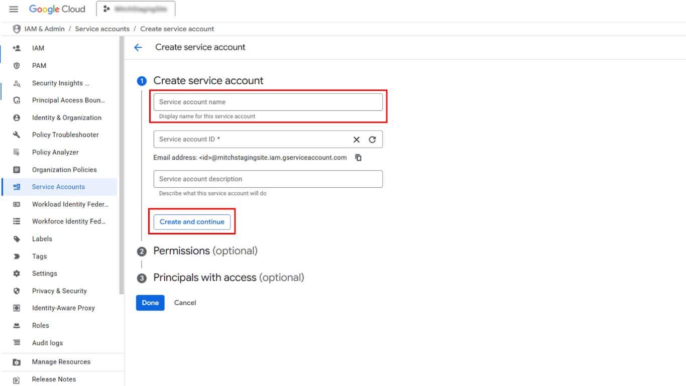 - Paste the service account email into the Dirección de correo electrónico campo.