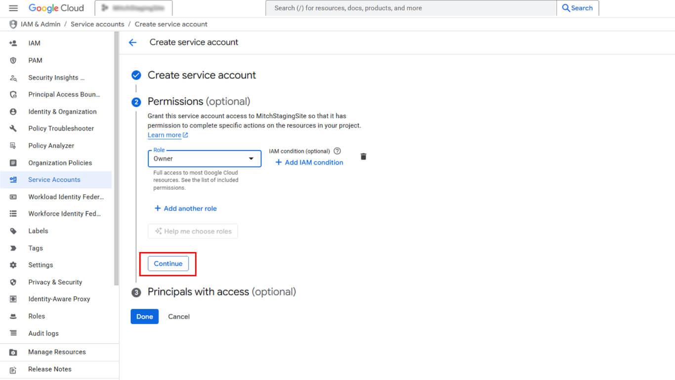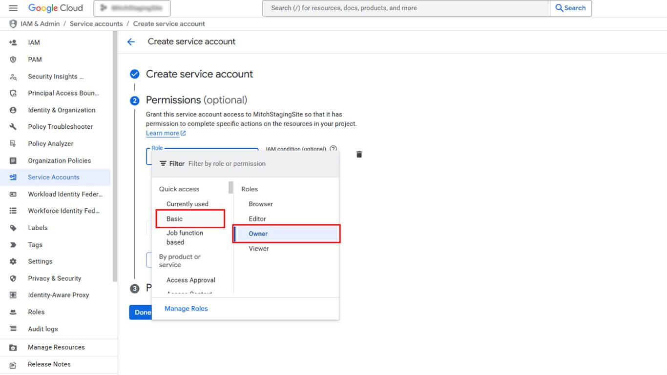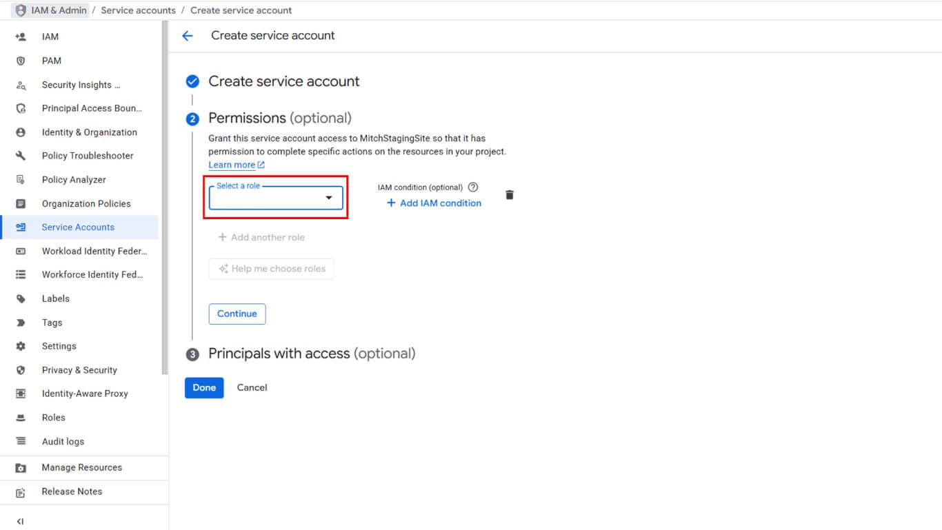 - Haga clic en Select a role dropdown under Grant this service account access.