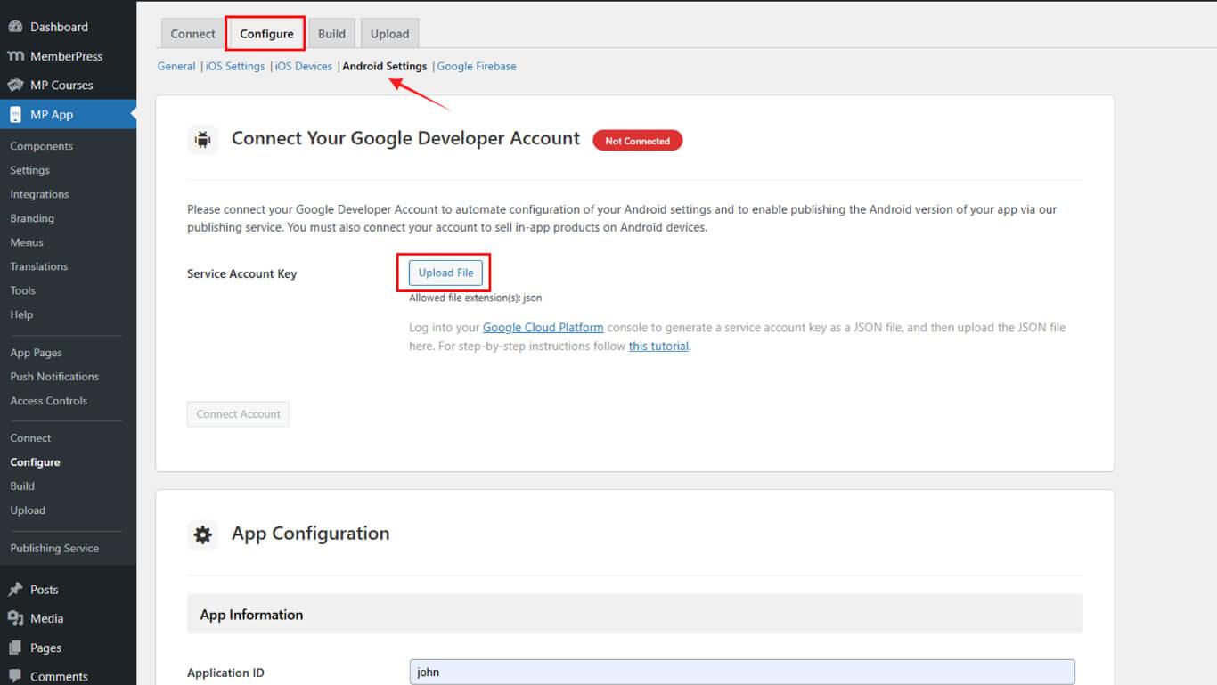 - Vaya a Dashboard > MP App > Configure > Android Settings.
