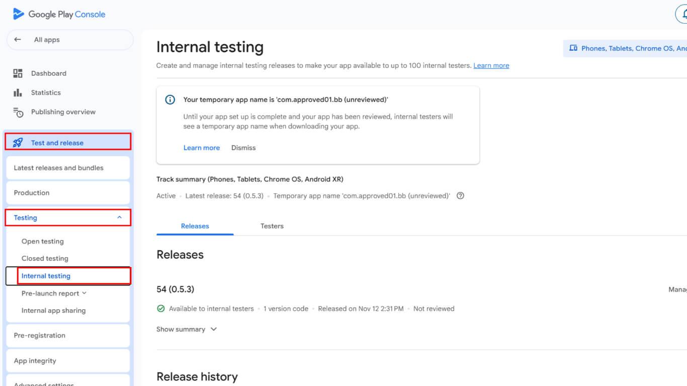 - Haga clic en Test and Release > Internal testing in the sidebar.