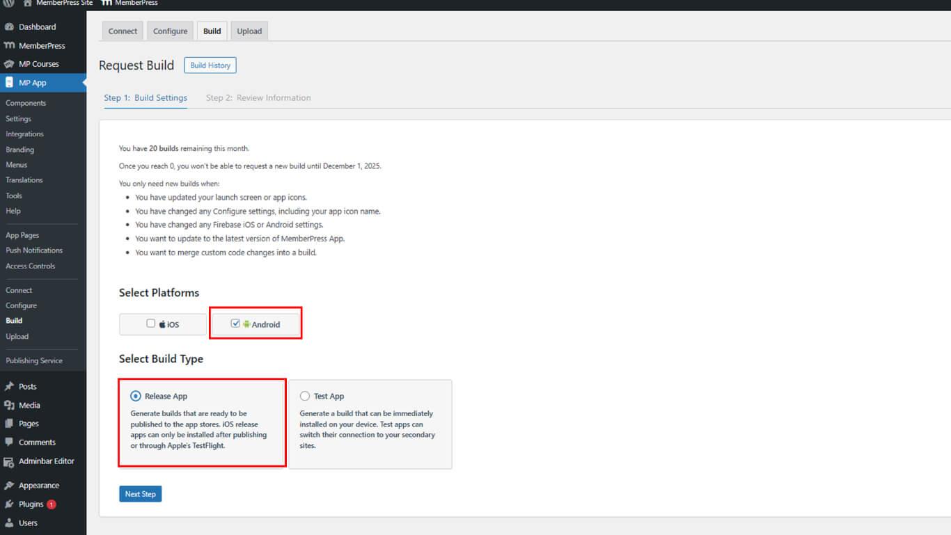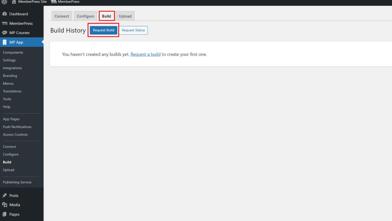 - Vaya a Dashboard > MP App > Build > Build History en WordPress.