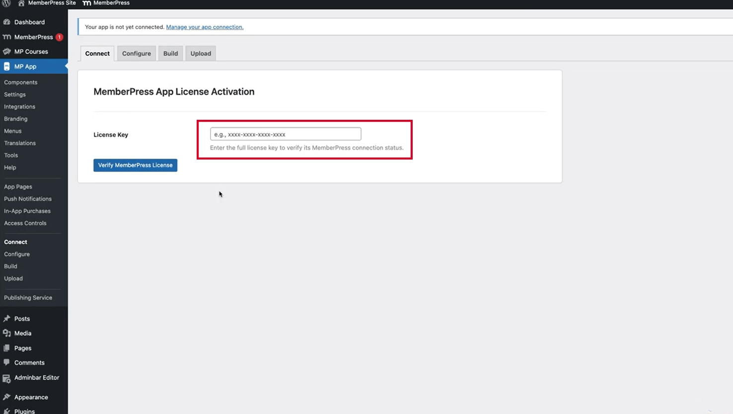 License key entry establishes a connection between your website and MemberPress App services.
