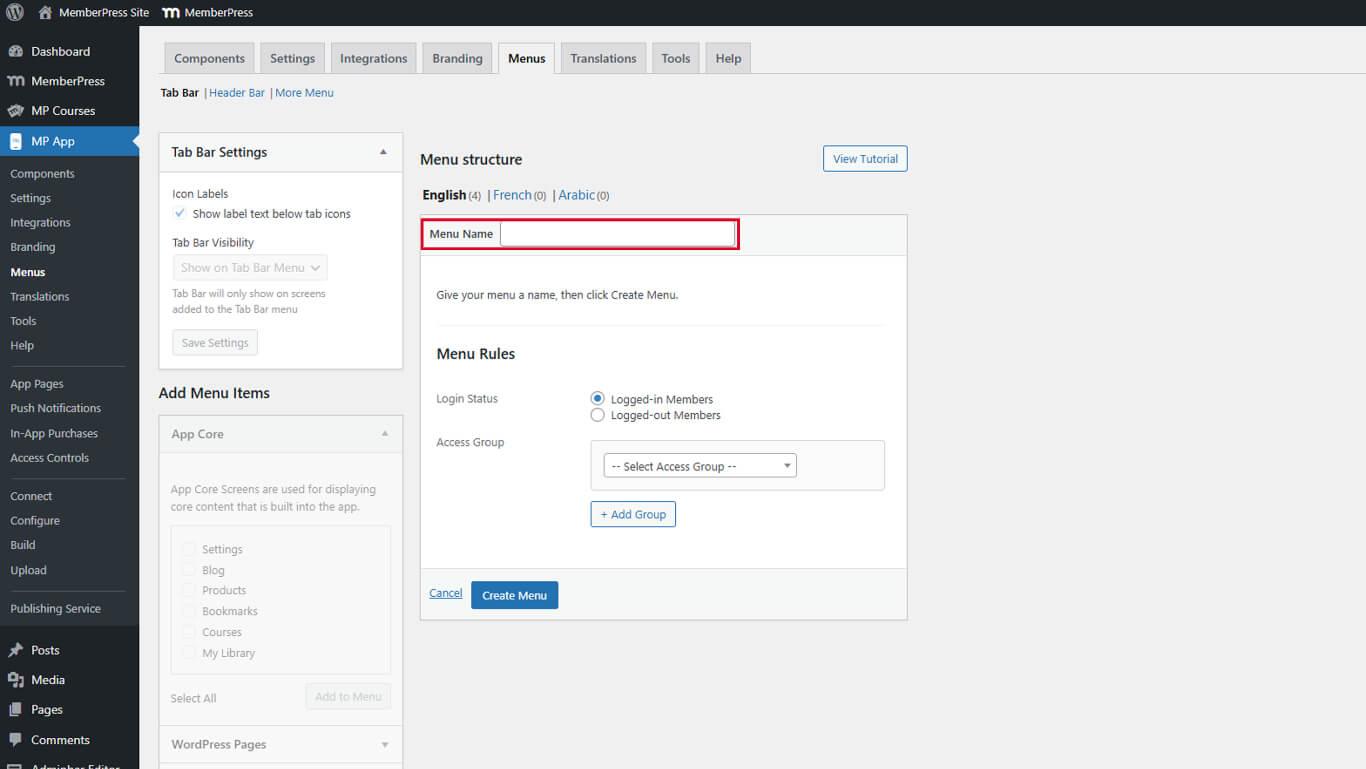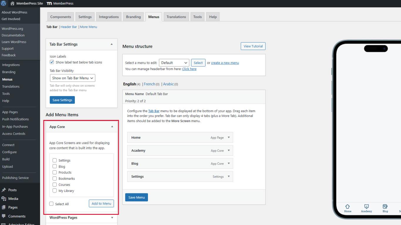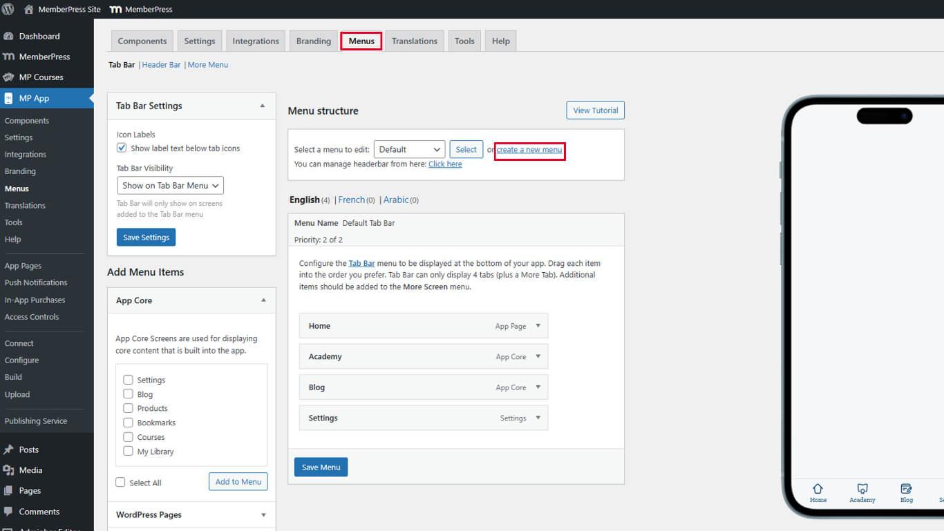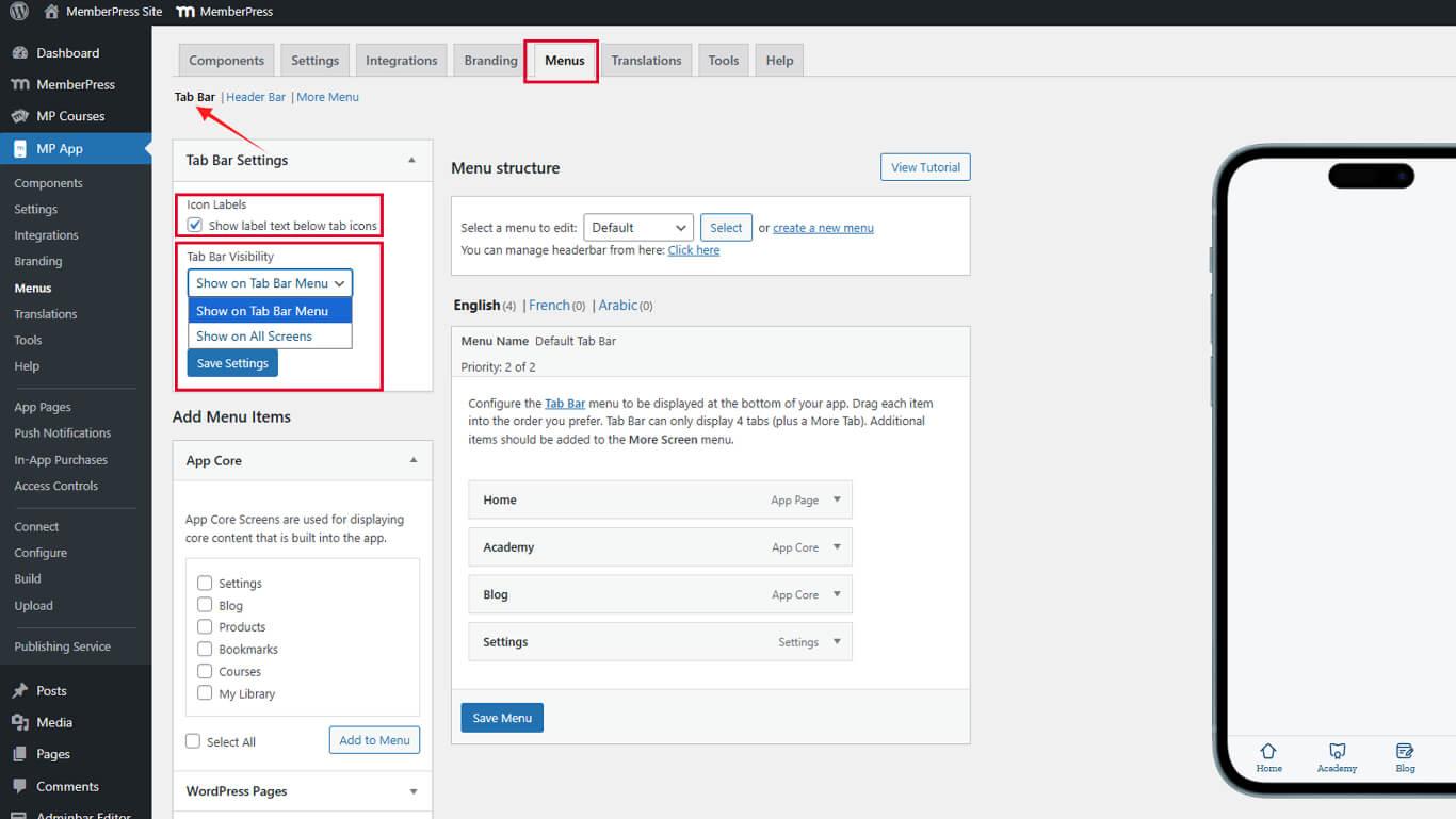 - Vaya a Dashboard > MP App > Menus > Tab Bar.