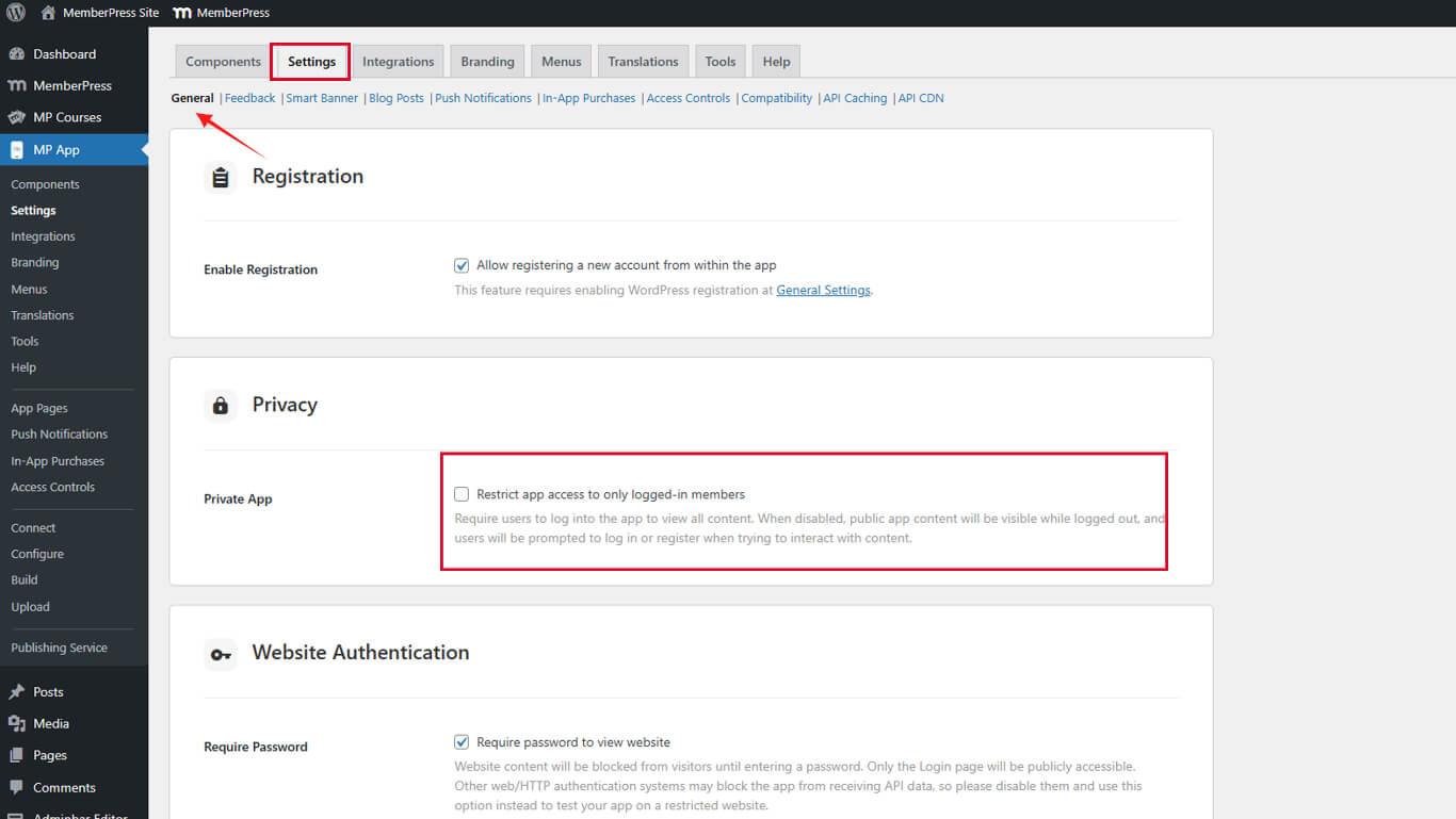 - Vaya a Dashboard > MP App > Settings > General > Privacy.
