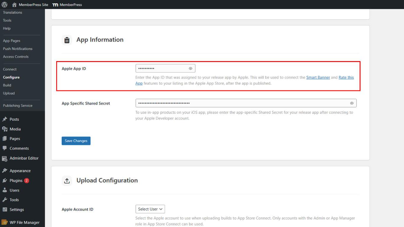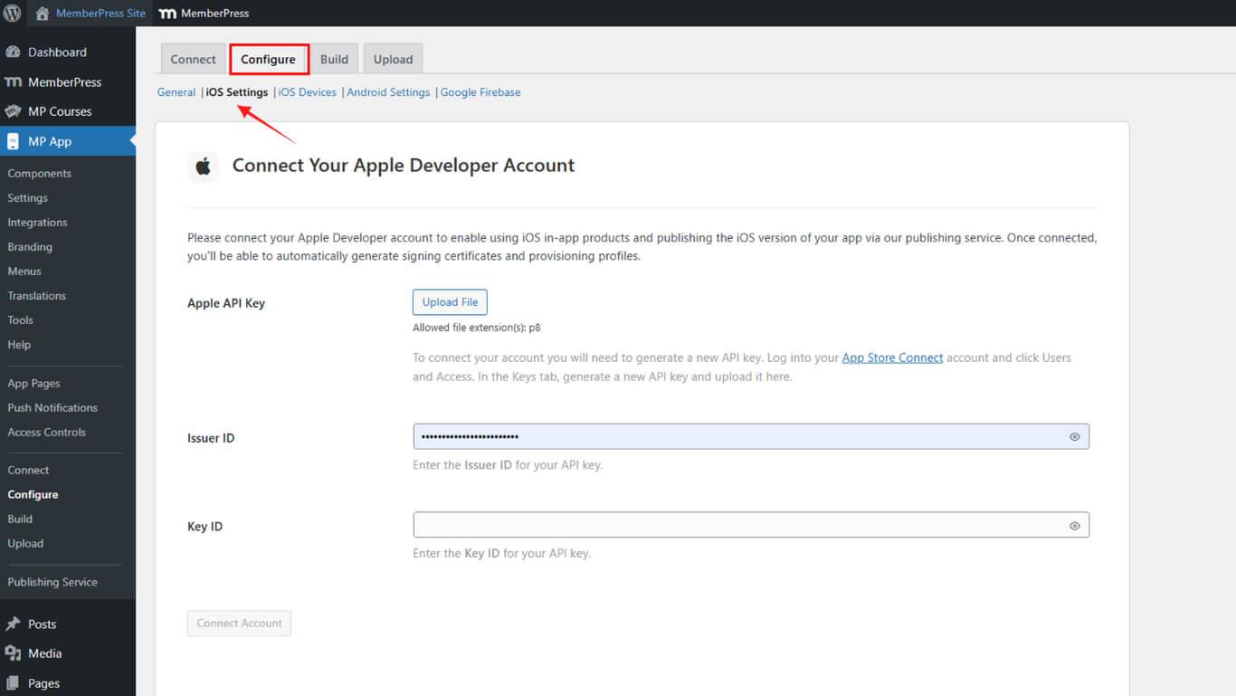 - Ir a Dashboard > MP App > Configure > iOS Settings.