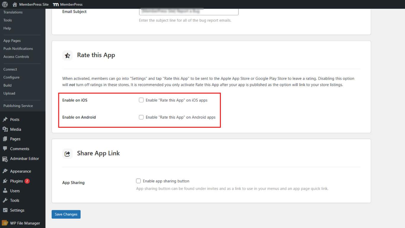 The Rate This App menu enablement activates review submission option in the mobile application settings.