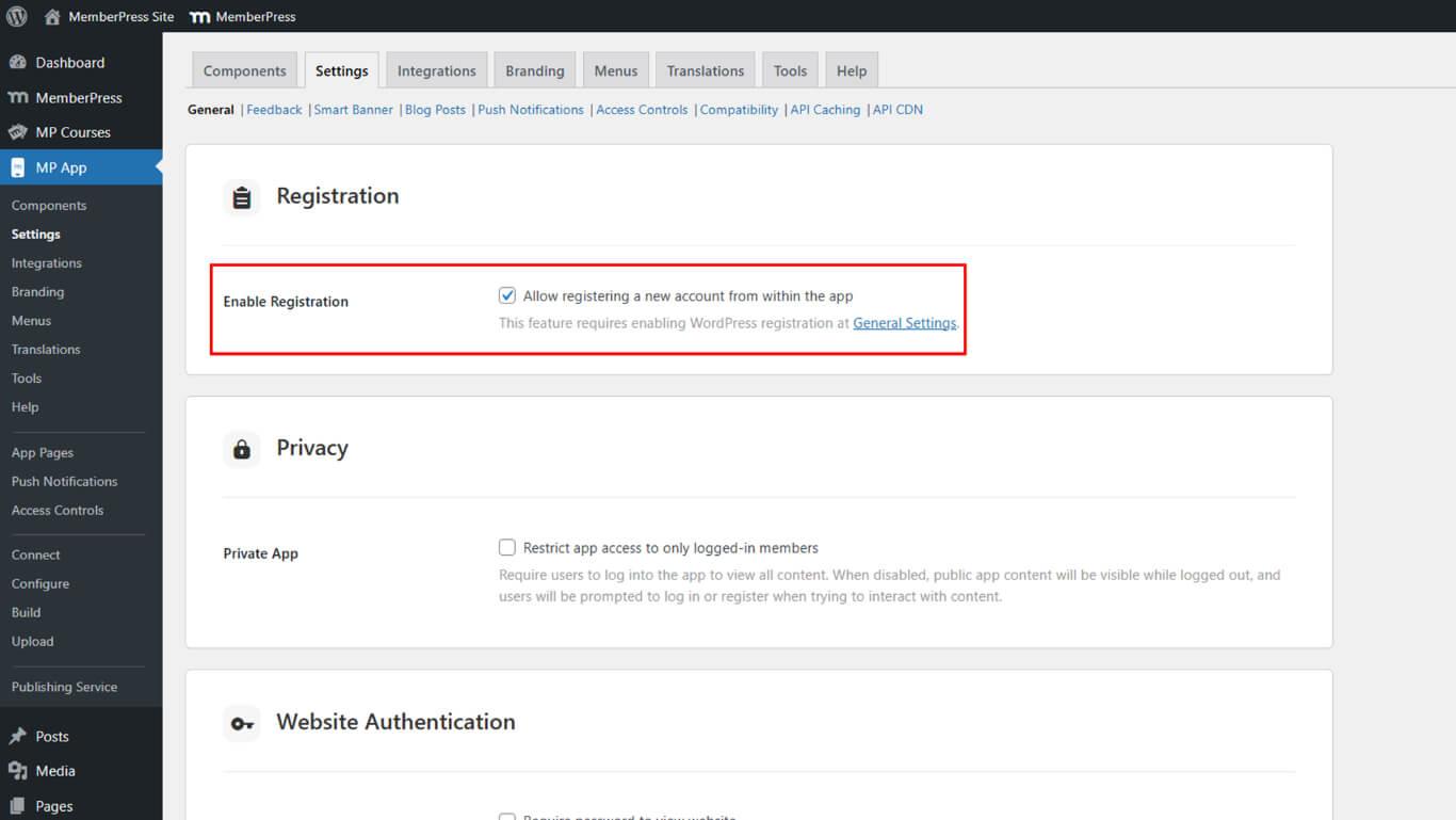 Enabling user registration allows new members to sign up directly through your mobile app and website, streamlining onboarding for both public communities and internal teams. This guide walks you through enabling registration from the MemberPress App settings.