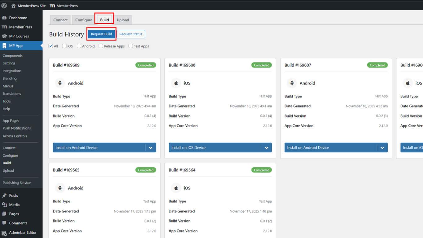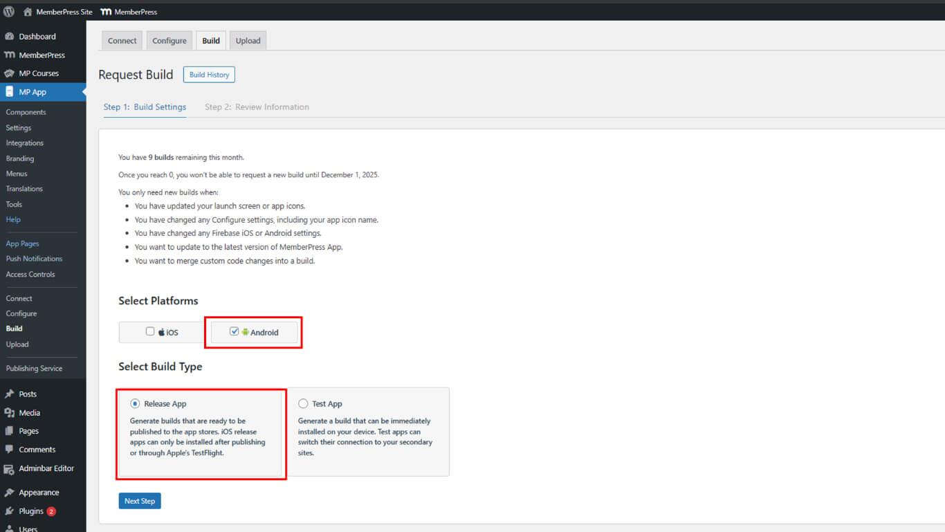 - Vaya a Dashboard > MP App > Build en WordPress.