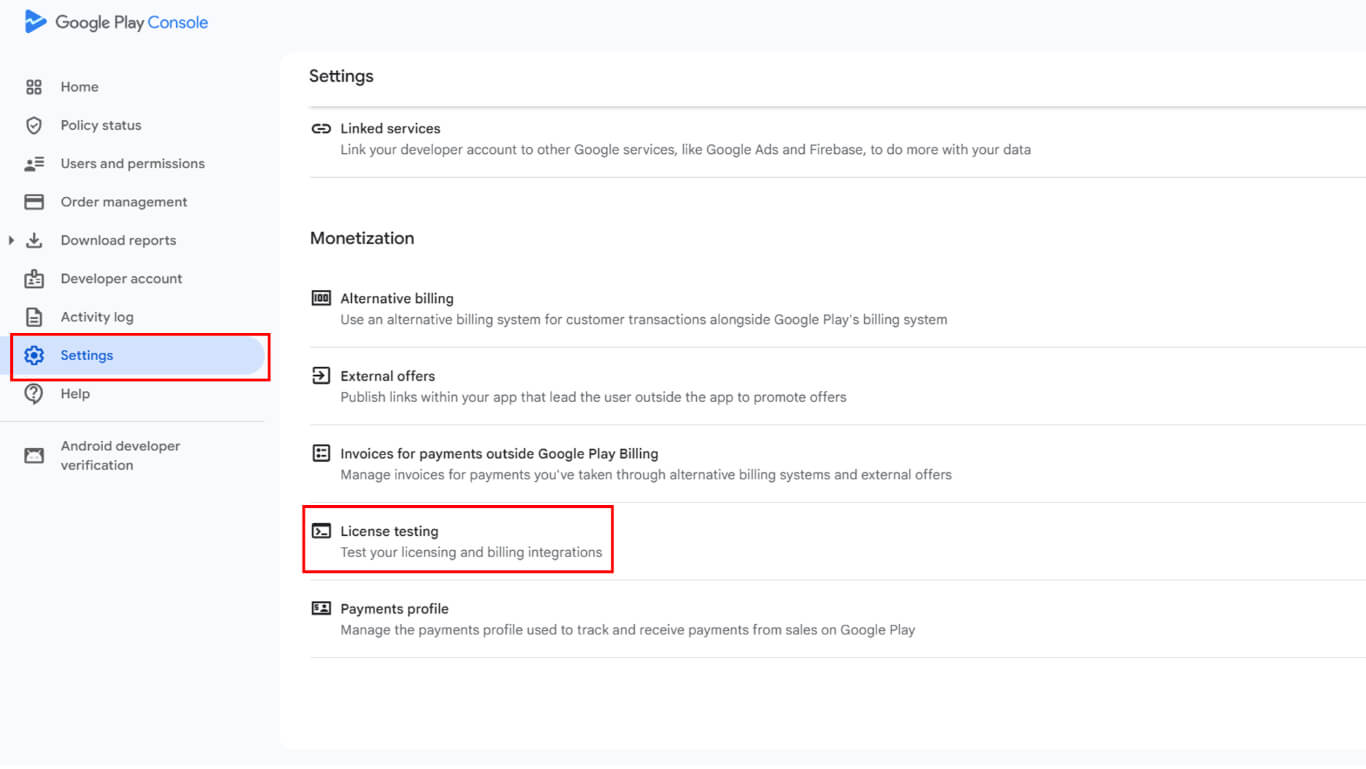 - Vaya a Settings > License testing in the Google Play Console sidebar.