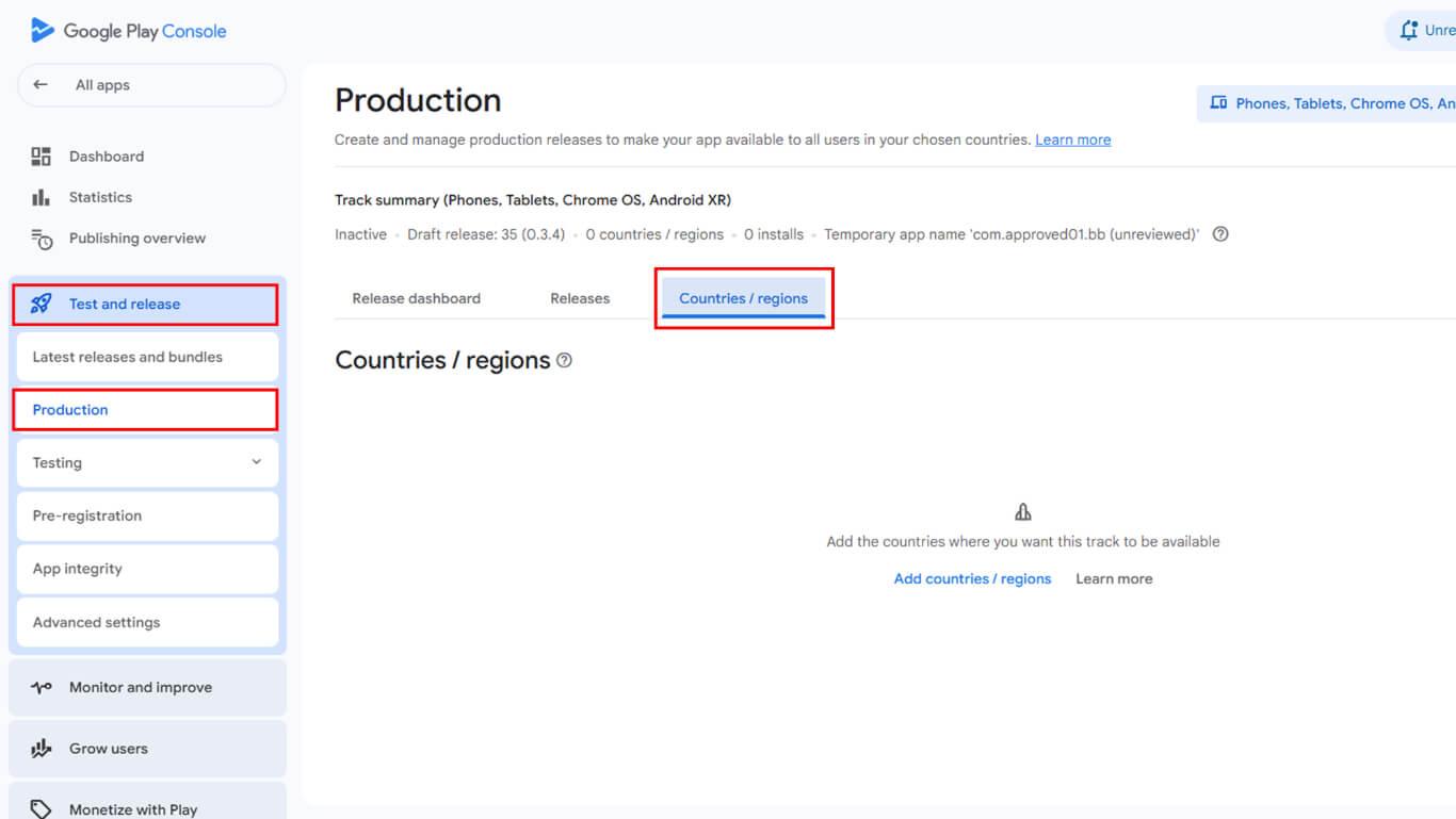 - Vaya a Test and Release > Production to verify country and region settings.