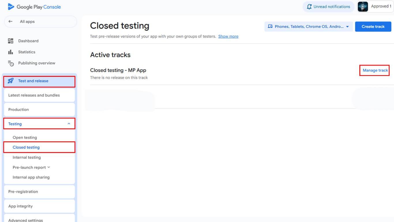 - Haga clic en Manage track next to the testing track.