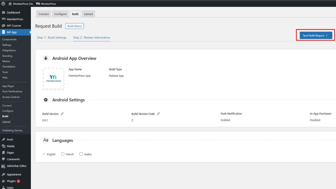 - Vaya a Dashboard > MP App > Build.