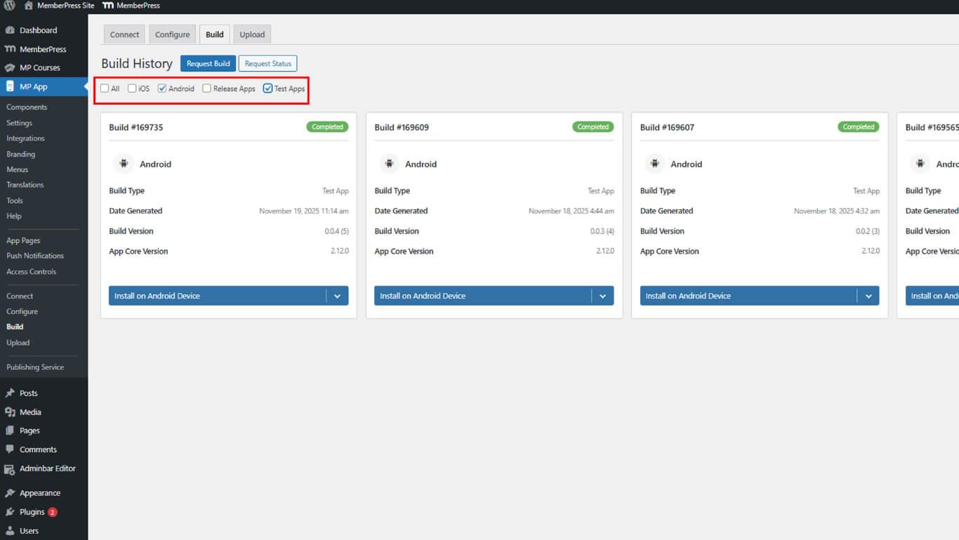 Android Test App builds enable rapid testing and development preview without Google Play Store submission. Test builds include site configuration, branding, menus, and custom code from GitHub repositories. This document explains how to filter Android Test App builds, install via QR code, and verify successful installation.