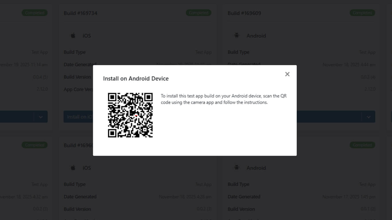 Android Test App builds provide a quick installation method for development and quality assurance activities. Test builds install directly via QR code without requiring Google Play distribution or approval processes.