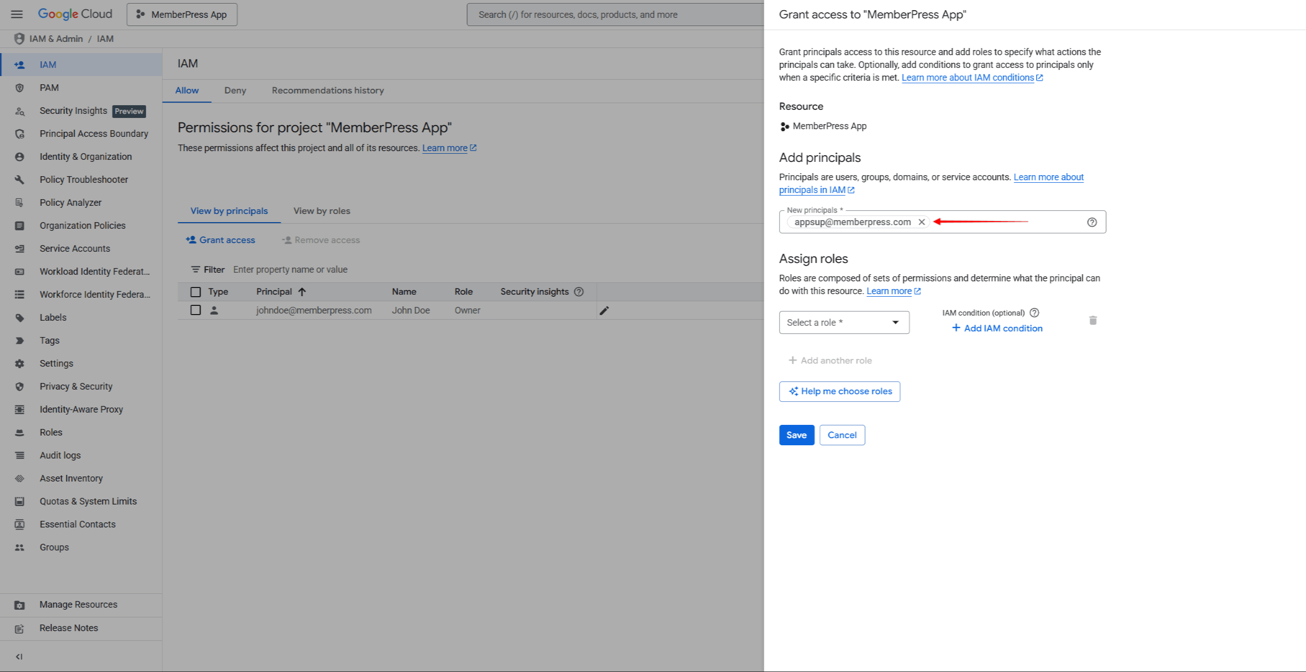 After granting access, verify that the MemberPress team appears in the IAM members list.