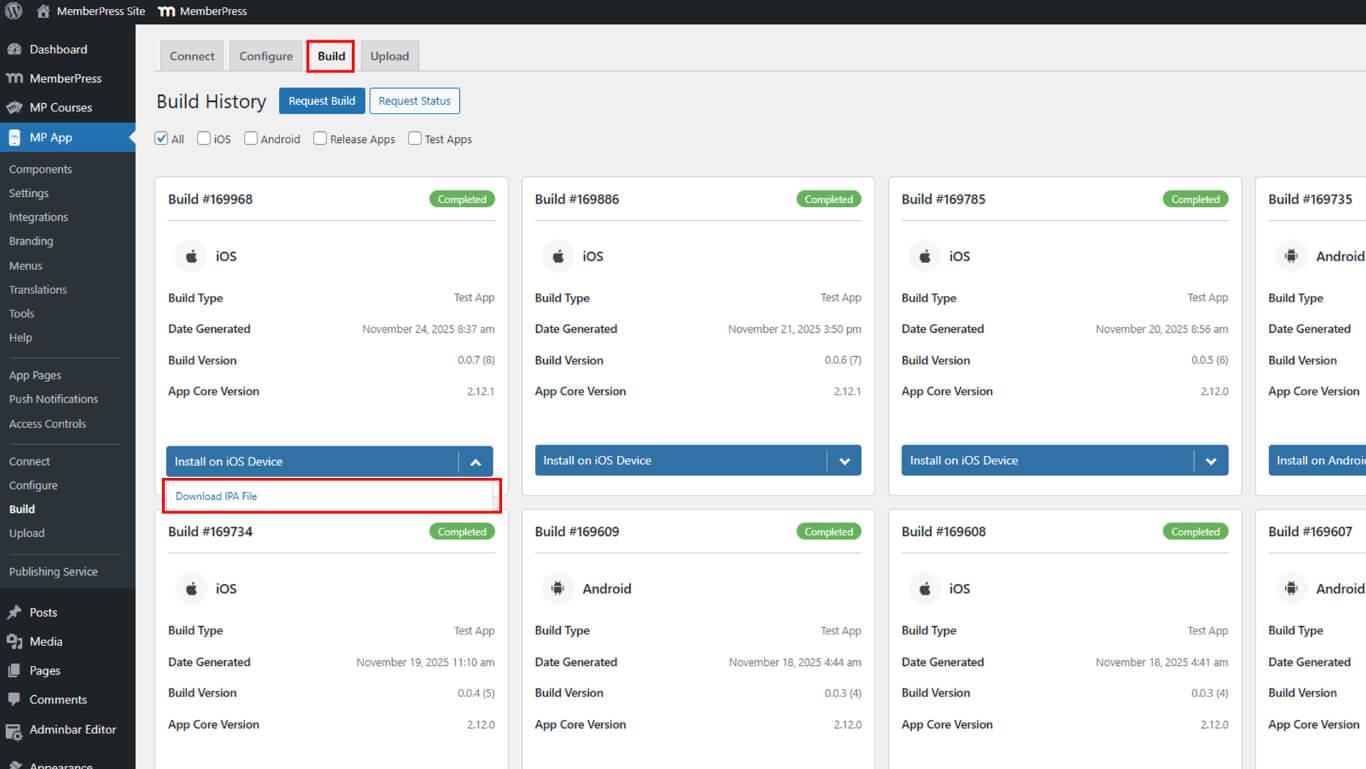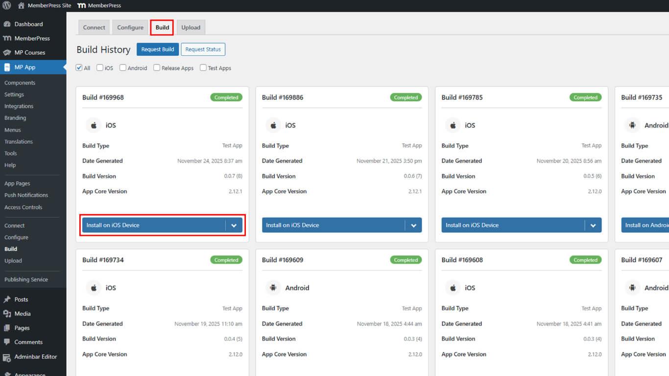 - In your WordPress admin, go to Dashboard > MP App > Build.