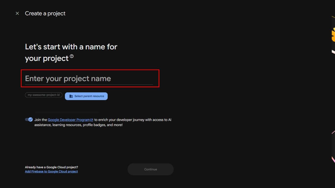 1. Introduzca un Nombre del proyecto y haga clic en Continúe en.