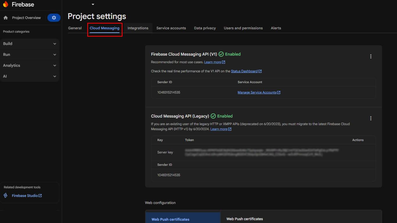 1. Copie el Server key displayed in the Cloud Messaging section.