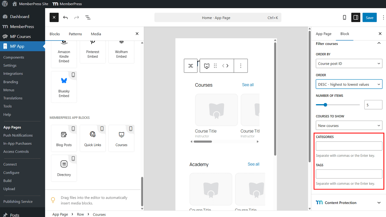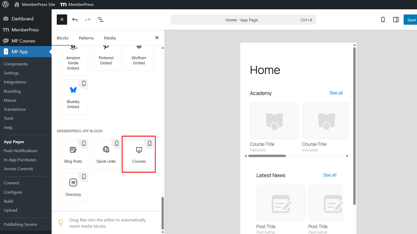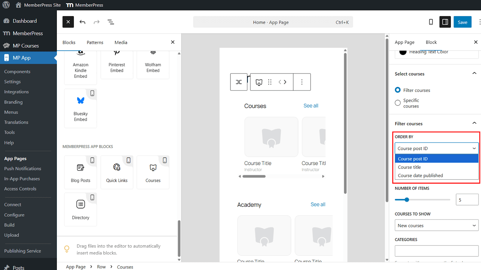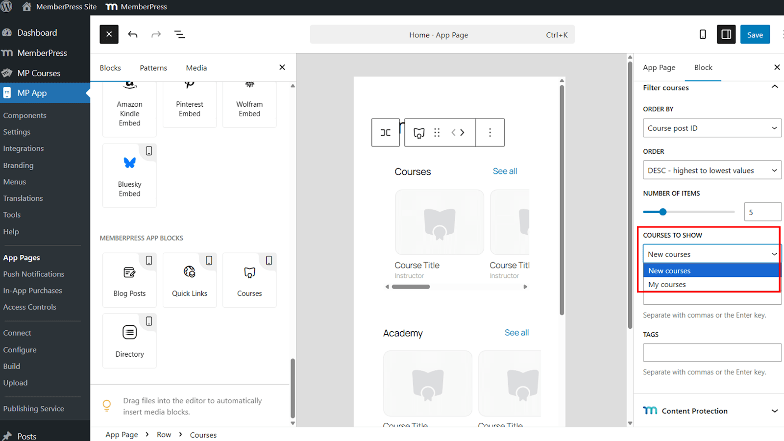 - Seleccione Cursos block from the Bloques de aplicaciones MemberPress sección.