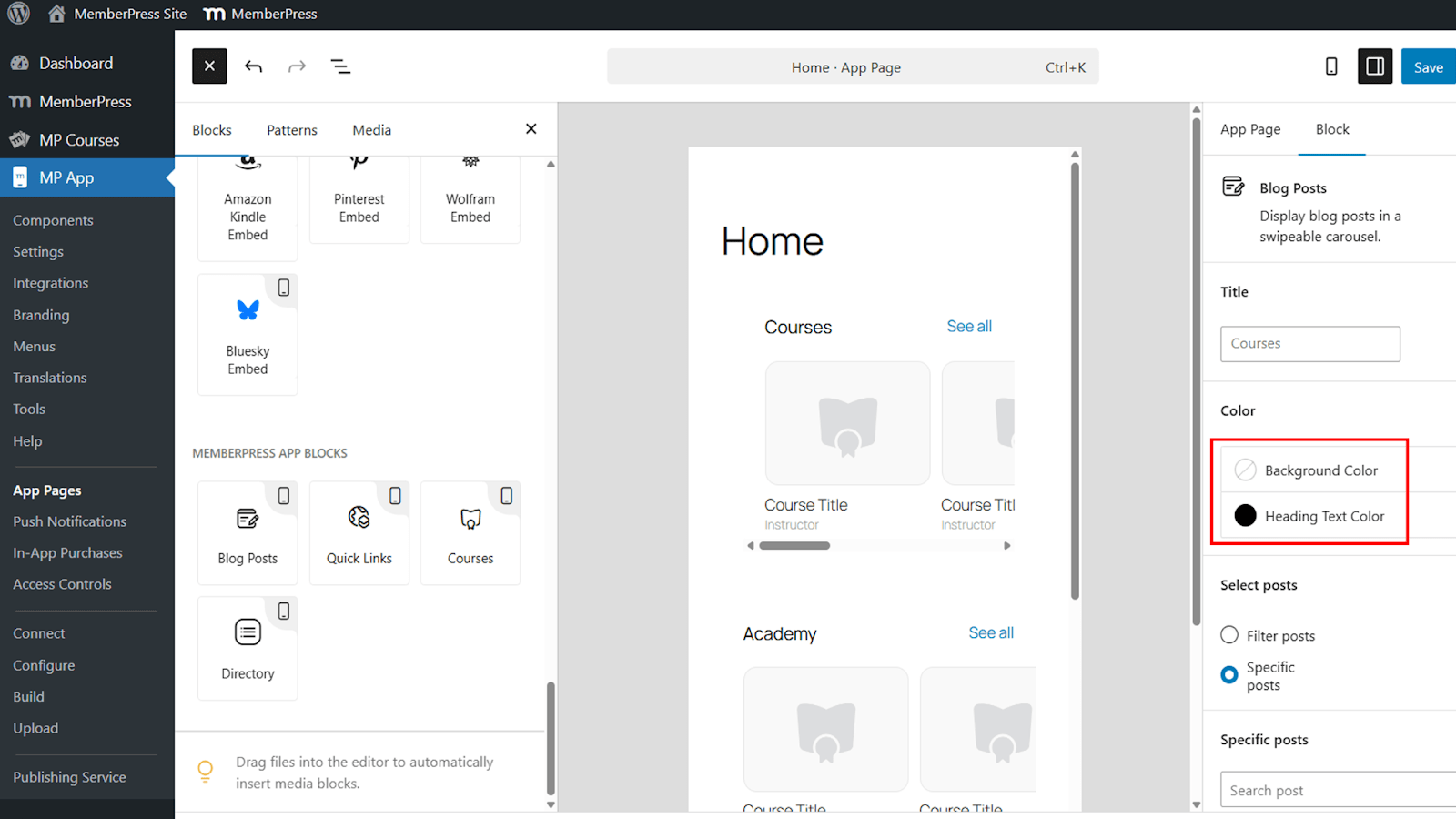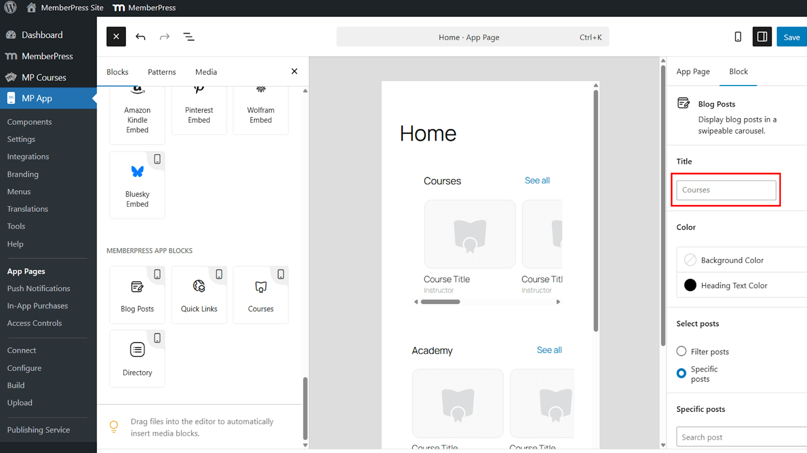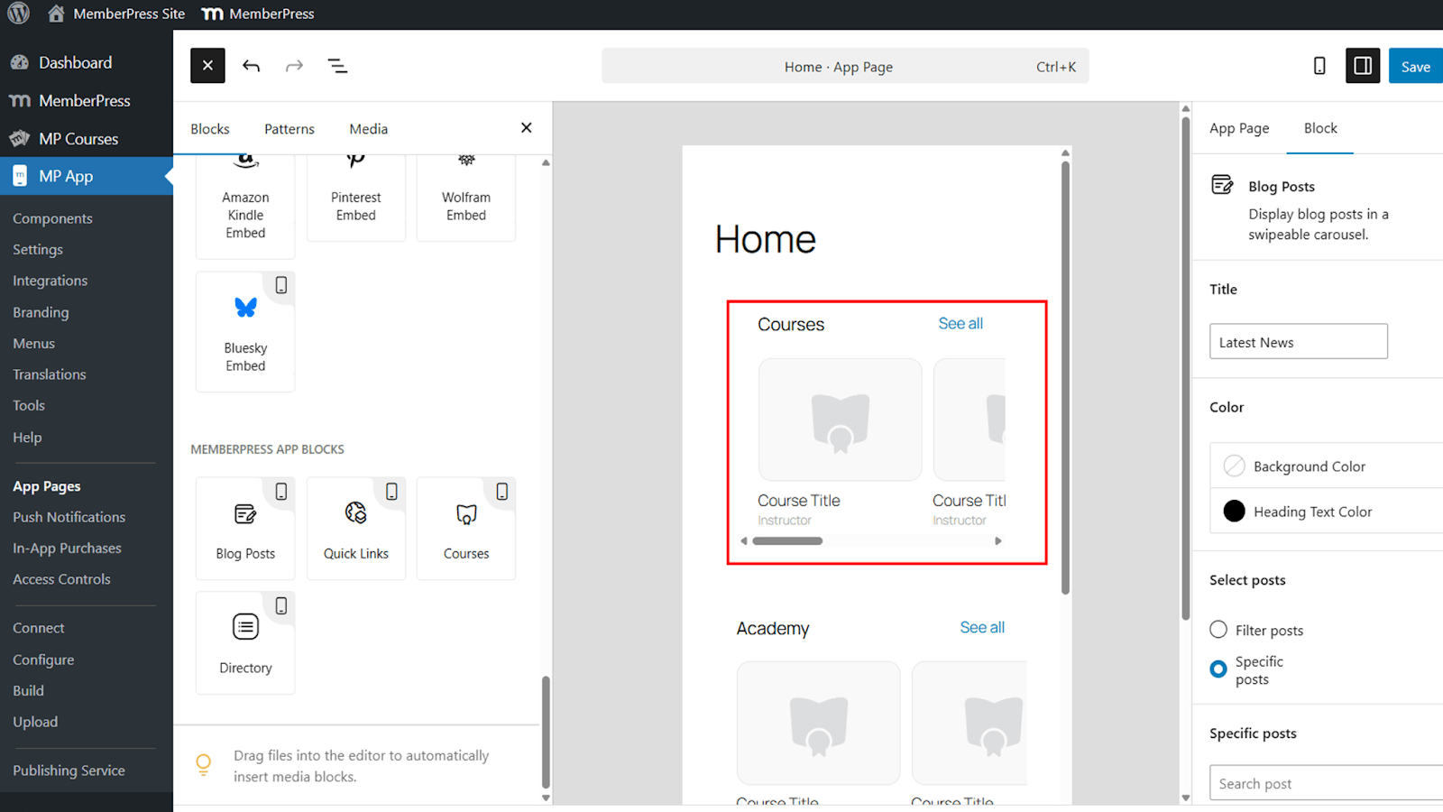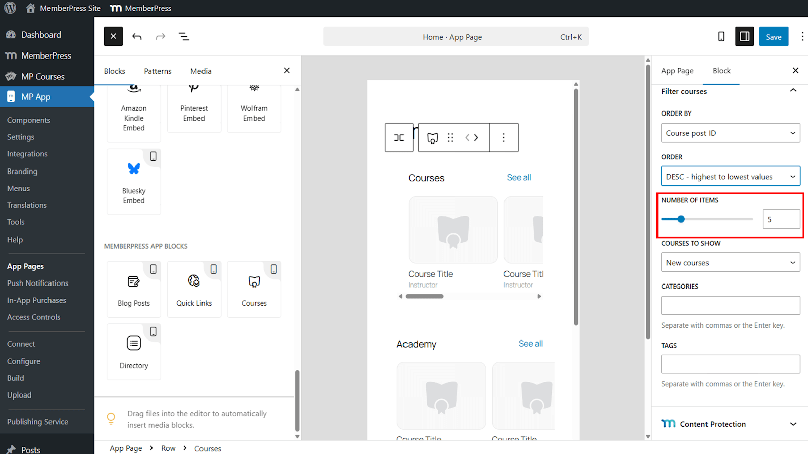 - Seleccione Cursos block from the Bloques de aplicaciones MemberPress sección.